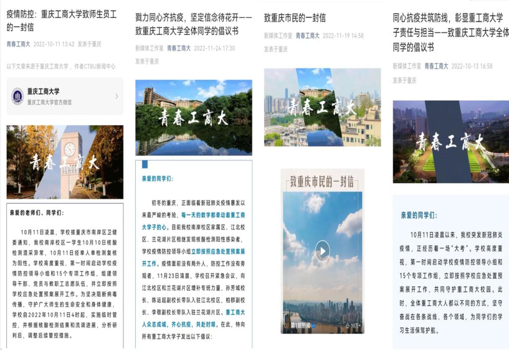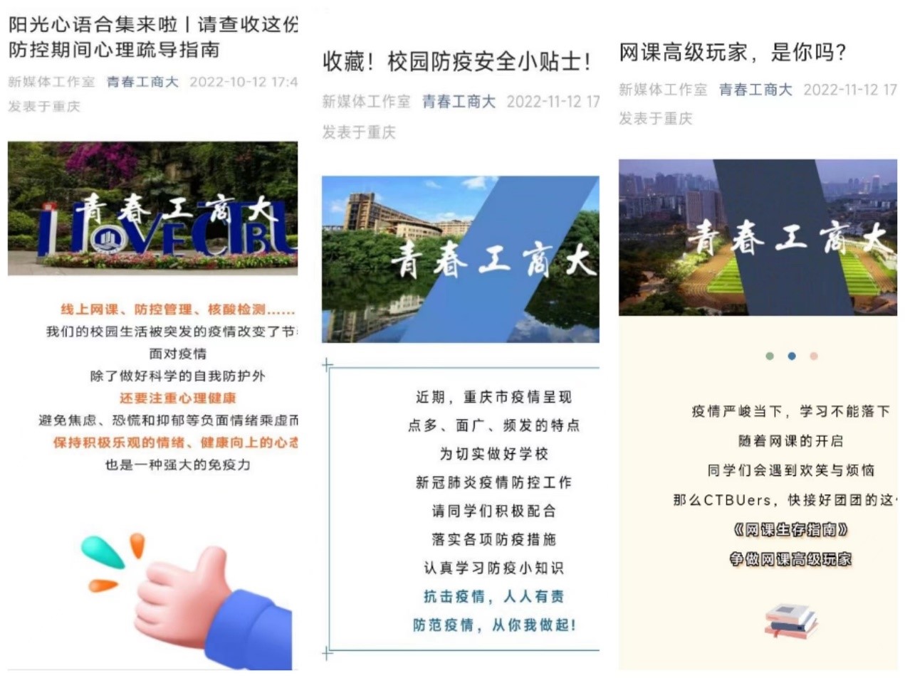 疫情当下,为鼓舞青年同心战疫,凝聚重工商大学子抗疫合力,新媒体工作室围绕防疫科普、思想引领、校园生活推出《收藏!校园防疫安全小贴士!》、《同心抗疫共筑防线,彰显重工商大学子责任与担当——致2138CC太阳集团全体同学的倡议书》、《戮力同心齐抗疫,坚定信念待花开——致2138CC太阳集团全体同学的倡议书》、《网课高级玩家,是你吗?》等微信原创推文,积极转载《阳光心语合集来啦|请查收这份疫情防控期间心理疏导指南》、《疫情防控:2138CC太阳集团致师生全员工的一封信》、《致重庆市民的一封信》等主流媒体推文,累积浏览量5000+,鼓励全体重工商大师生携手同心,保持积极乐观、健康向上的良好心态,了解正确防疫知识,积极服从学校疫情防控安排,在战“疫”的紧要关头,一起打赢这场疫情歼灭战,共同守护美好校园。