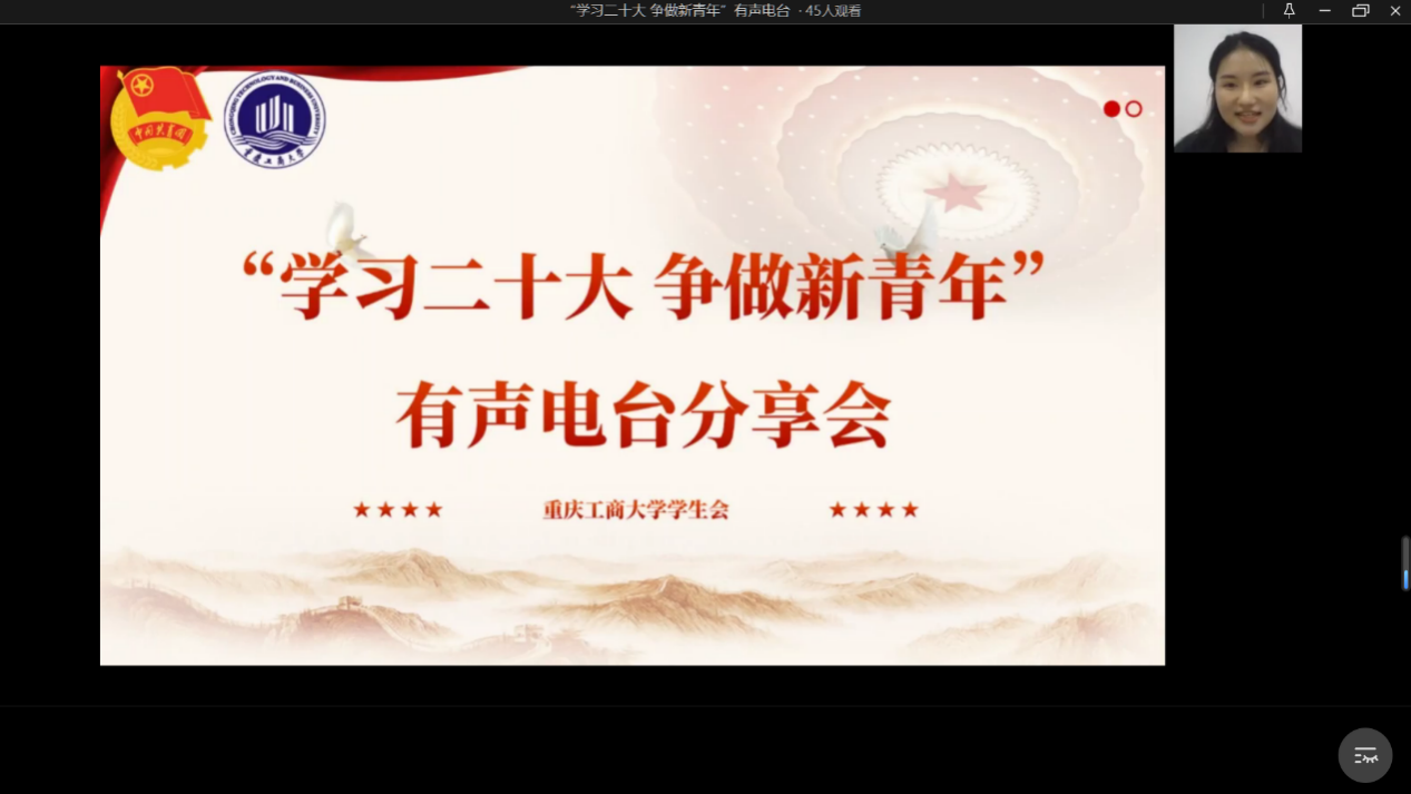 为进一步引导和鼓励广大青年学子争做有理想、敢担当、能吃苦、肯奋斗的新时代好青年,切实把思想和行动统一到深入学习贯彻党的二十大精神上来, 11月13日下午,由校团委主办的、校学生会承办的“学习二十大,争做新青年”有声电台分享会通过企业微信线上直播方式顺利举行。本次分享会邀请到3位优秀学生代表分享自己的学习、生活经验。