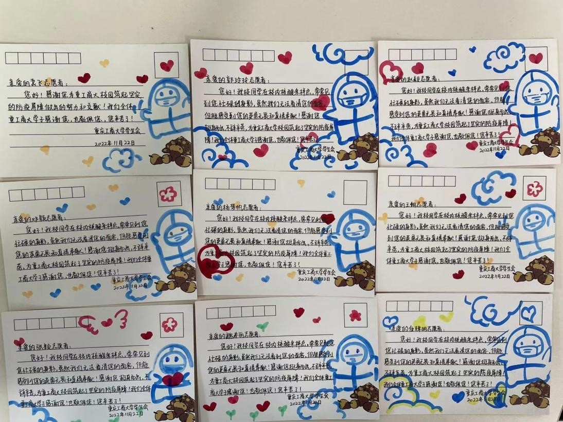 11月22日下午,校学生会看望慰问重庆医科大学来我校开展核酸采样工作志愿者,并送上手工制作的感谢卡片,向这群“最美逆行者”致敬,感谢他们为守护我校师生安全作出的努力和奉献。
