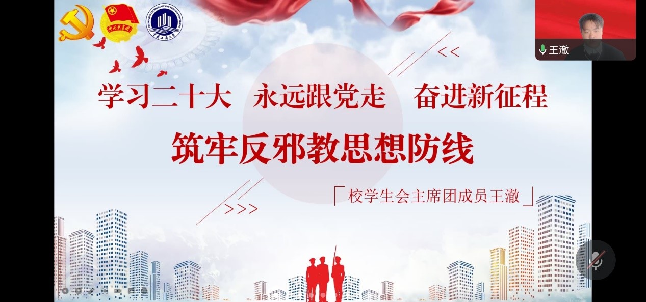 为增强广大师生识邪防邪拒邪能力,进一步筑牢学校反邪防渗和意识形态阵地,维护学校安全稳定,营造积极向上的校园氛围,11月22日,我校于企业微信线上直播举办“总体国家安全观”宣讲会,学生会全体人员参与会议。本次会议旨在提高学生反邪教意识,切实强化青年学生总体国家安全观意识,为维护学校安全稳定,弘扬社会主义核心价值观,筑牢防范抵御邪教侵蚀的思想防线贡献力量。