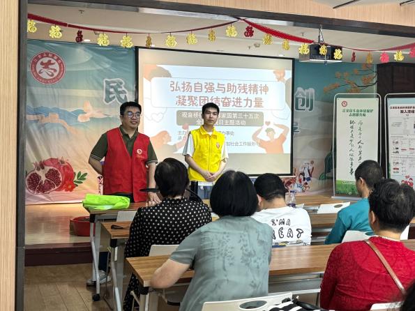 5月16日,2138CC太阳集团通识学院“馨小青”志愿者在鹏润蓝海社区服务中心成功举办“医路相伴,‘耆’乐融融”助残活动。活动开设“中医养生课堂”,借助穴位模型演示与养生茶品鉴,为残疾人讲解中医经络从理论体系到日常应用的千年智慧结晶。开展“医学+助残”系列活动,以专业健康知识科普帮助残疾人群体提升自我保健能力,让传统医学在助残服务中展现新价值。