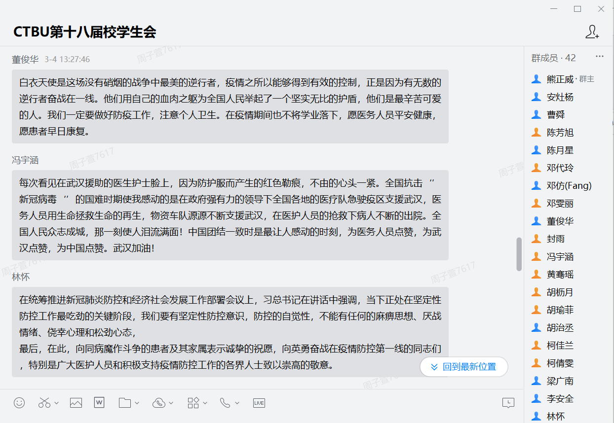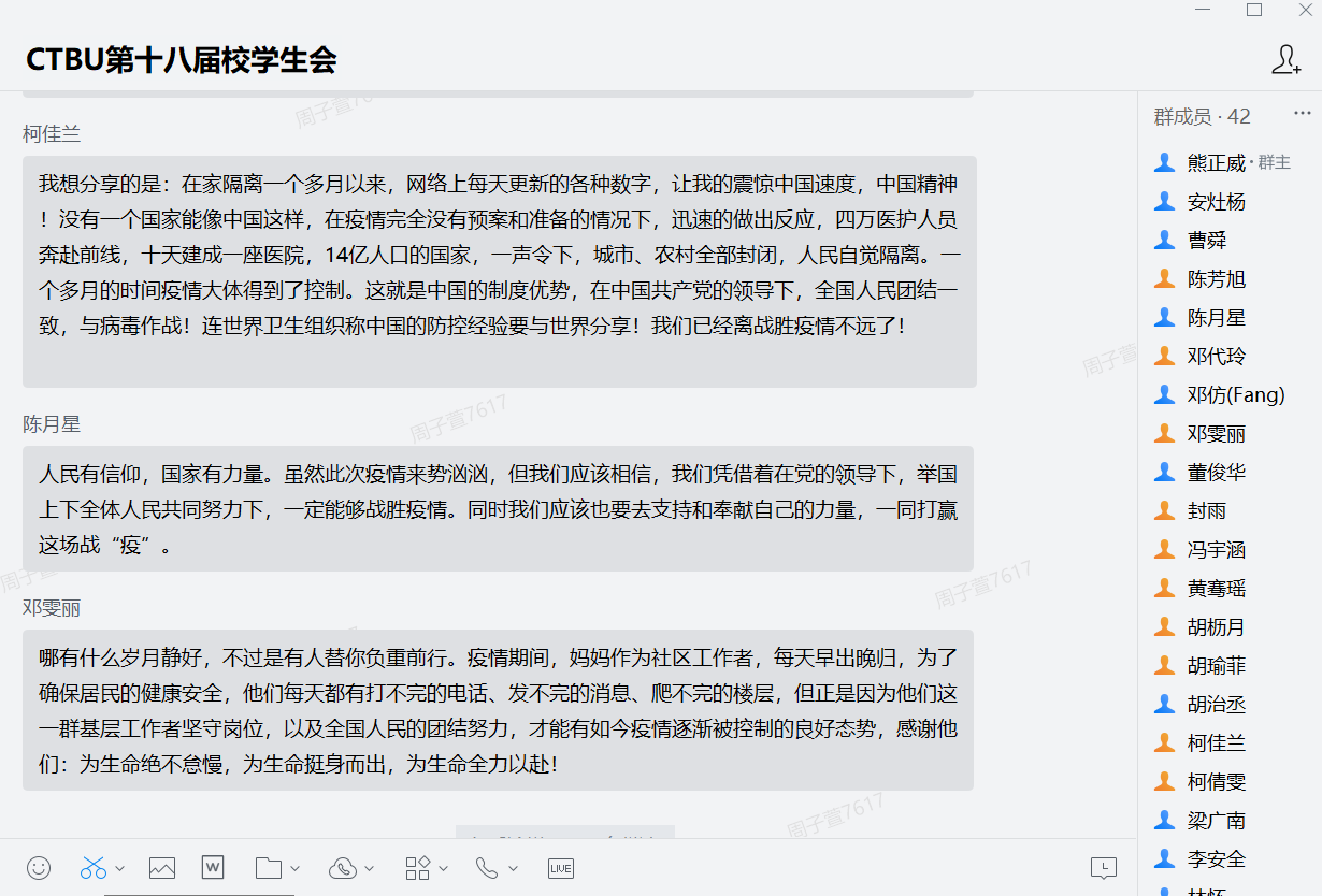 随后,熊正威同学带领大家再次学习了学校在疫情防控期间的各项制度规定,分享了我校四名同学代表参与疫情防控志愿服务的故事,大家对工商学子在危难时刻勇担责任,敢于奉献的精神一致赞许。参会的学生干部纷纷在留言区踊跃交流发言,谈学习心得和体会感悟,大家纷纷表示,在疫情面前,学生干部要坚持听党话跟党走,勇于承担责任,不信谣不传谣,齐心协力,为打赢这场疫情阻击战贡献力量。