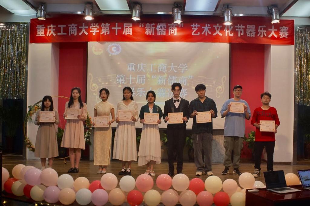 从初赛脱颖而出的十位选手齐聚一堂,展开了激烈的角逐。悠扬的钢琴独奏《人生的旋转木马》,空灵的陶笛曲目《大鱼》、柔和的古筝曲目《幻想曲》、活泼的吉他曲目《Heart》逐一展示。整个比赛过程中,演出节奏时而轻松明快,时而慷慨激昂,选手们用出色的表现为现场观众带来了一场精彩的视听盛宴。最终,经过评委评分与观众投票,通识学院的冉晨茜同学获得金奖;通识学院唐何金成同学、经济学院卞美杰同学获得银奖;通识学院王山辉同学、法学与社会学学院李至臻同学、人工智能学院蒲双喜同学获得铜奖;国际商学院谭可涵同学、机械工程学院买买提明·司拉木同学、会计学院刘思晨同学、经济学院于易民同学获得优秀奖。在祝贺与鼓励的掌声中,我校第十届“新儒商”艺术文化节器乐大赛决赛圆满结束。