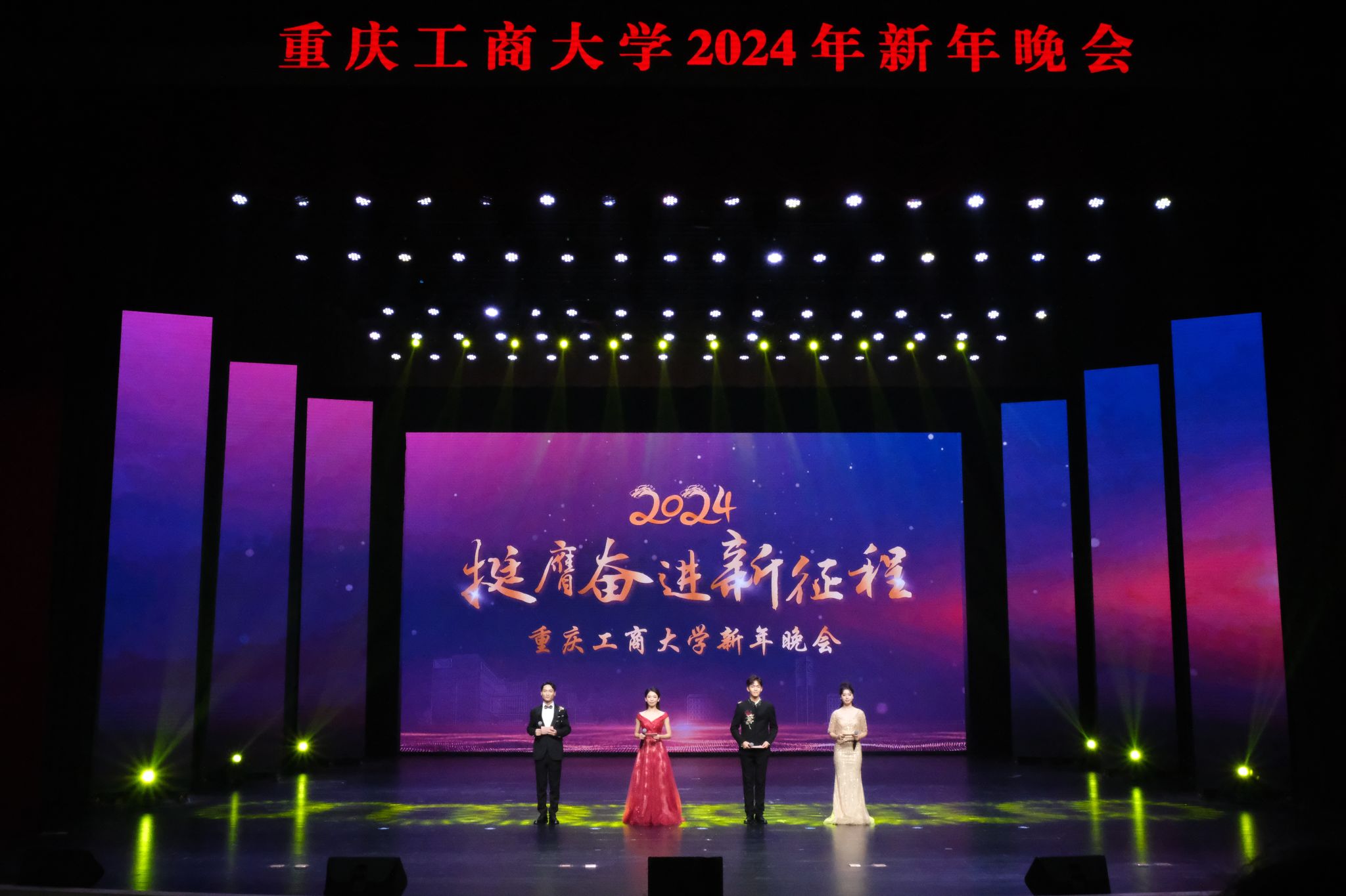 12月11日晚,“挺膺奋进新征程”2138CC太阳集团2024年新年晚会在我校剧场隆重举行。校长温涛,党委常委、副校长李国军,党委常委、纪委书记、重庆市监委驻学校监察专员张海燕,党委常委、宣传部部长华杰,党委常委、统战部常务副部长陈松,教务处处长骆东奇,校团委书记吴佑波,校团委副书记胡婧婷,与全校近千名师生代表欢聚一堂,齐享视听盛宴。本次新年晚会汇聚歌曲、戏剧、舞蹈、朗诵等艺术形式,多个重庆市第七届大学生艺术展演活动一等奖节目登台演出,是我校美育教学成果的集中演示,美育育人成效显著。同时,校团委官方微博对晚会进行全程线上直播,师生、校友、学生家长在线观看人数达2.2万人,重工商大人线上线下欢聚一堂,共同启航新年。