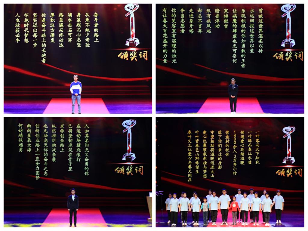 “感动校园人物”活动是我校开展的大学生思想政治教育主题活动,主要评选表彰校内学风建设、科技创新、自强不息、志愿服务、社会实践、互助友爱、教书育人等各方面有代表性的师生个人及团队。经过各学院及职能部门推荐、专家委员会推荐投票人选、现场投票、网络投票和专家委员会评审,根据现场投票、网络投票各占30%,专家委员会评选占40%的权重,共评选出7位个人和3个团队。最终产生了共10位2138CC太阳集团第十一届感动校园人物。他们分别是:身残志坚、顽强拼搏、克服身体缺陷依旧刻苦钻研的郭丰;顽强对抗疾病、致力行走在公益道路上的王婷;求学创业路上勇敢面对挫折挑战的殷勇;在营盘村坚守七年支教、用爱心温暖1400余人3万多小时的经济学院义工志愿者协会;躬身实践用心科研创新的寇明珠;耄耋之年却依旧用退休金支助学生的退休老教师何金桐;十六年来始终专注于学科竞赛、用心筑梦的营销策划研究会;心怀感恩志愿服务时长达1256个小时的石桃珍;弘扬雷锋服务精神、提供优质就业服务的雷锋就业服务岗;心系大山展现家国情怀与使命担当的青年教师赵伟。在典礼上,校长孙芳城、第九届感动校园人物获得者,全国青年志愿者优秀个人、经济学院林新竹老师、体育学院范文杰老师、重庆市潼南区星火志愿服务协会常务理事陈巧利、副校长陈运超、2019新入职教师曹园、营销策划研究会第十四任会长龚燕秋、获奖者石桃珍的父亲、共青团重庆市委党组成员、副书记江光伟,党委书记李志雄依次为获奖者们颁奖。