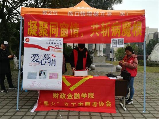 3月3日到3月9日,财政金融学院“星火”义工志愿者协会在南岸、江北、兰花湖三个校区举办了“凝聚同窗情,共斩病魔根”为主题的爱心募捐活动。为财政金融学院17级患白血病女同学带去爱的力量,陪她共渡难关。