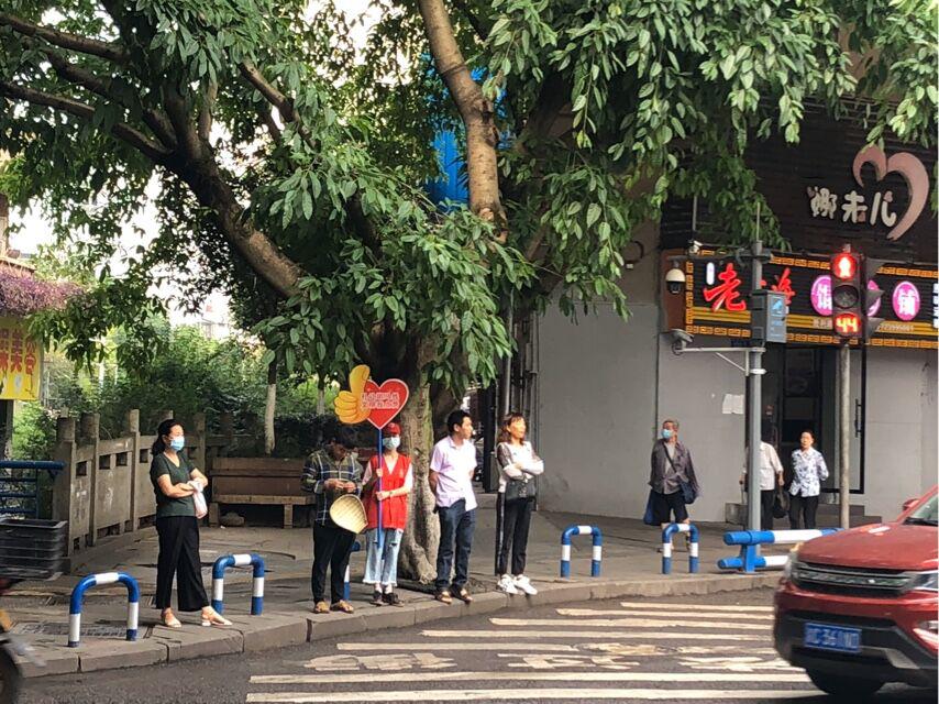 在交通组的胡佳同学主要负责劝导行人遵守交通秩序。顶着烈日,举着告示牌,尽管汗流浃背,但胡佳同学仍觉快乐。每当她成功引领一位行人穿越马路,她都有一种喜悦感与成就感涌上心头。特别是每当路人询问她是否是志愿者时,她都会坚定地回答道:“是的,今天是咱们社区的主题党日活动,我不仅是一名志愿者,也是一名入党积极分子,以后也想成为一名党员。”
