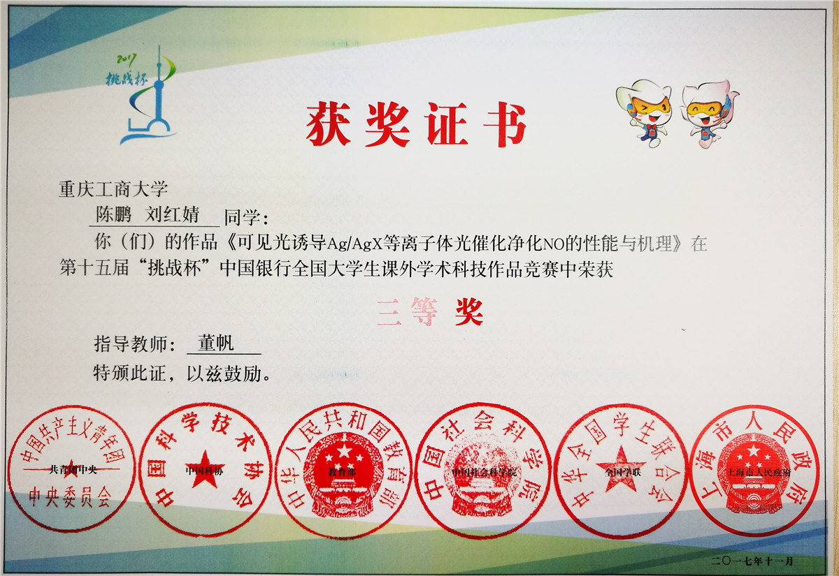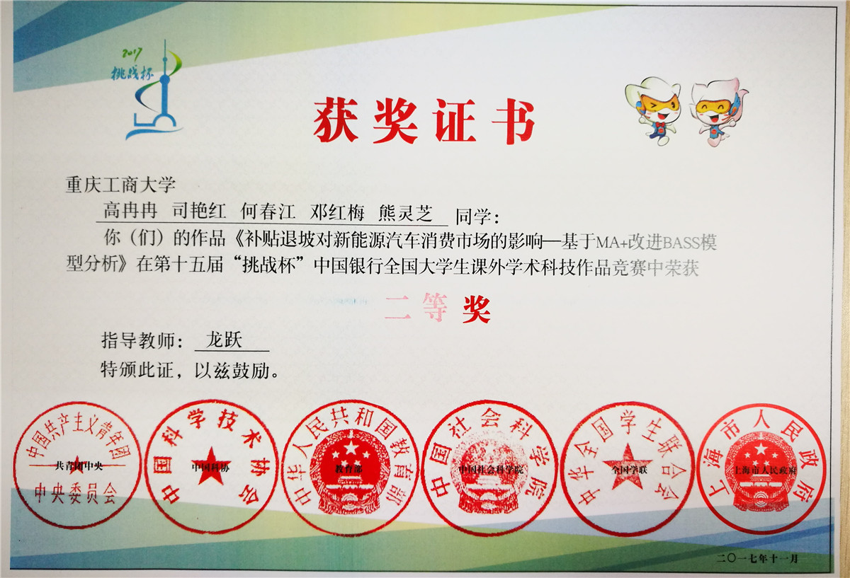 本届“挑战杯”共有32个省(区、市)、1739所高校的28594件作品参赛,经过层层选拔,314所高校的755件作品进入终审决赛。最终经网络初评、集中复评、决赛问辩,我校研究生作品《补贴退坡对新能源汽车消费市场的影响——基于MA+改进BASS模型分析》(指导教师龙跃)荣获全国二等奖,本科生作品《可见光诱导Ag/AgX等离子体光催化净化NO的性能与机理》(指导教师董帆)、《知识产权质押融资面临的困境及破解之道》(指导教师华鹰)荣获全国三等奖。成为我校在“挑战杯”全国大学生课外学术科技作品竞赛全国决赛中获奖数最多的一届。