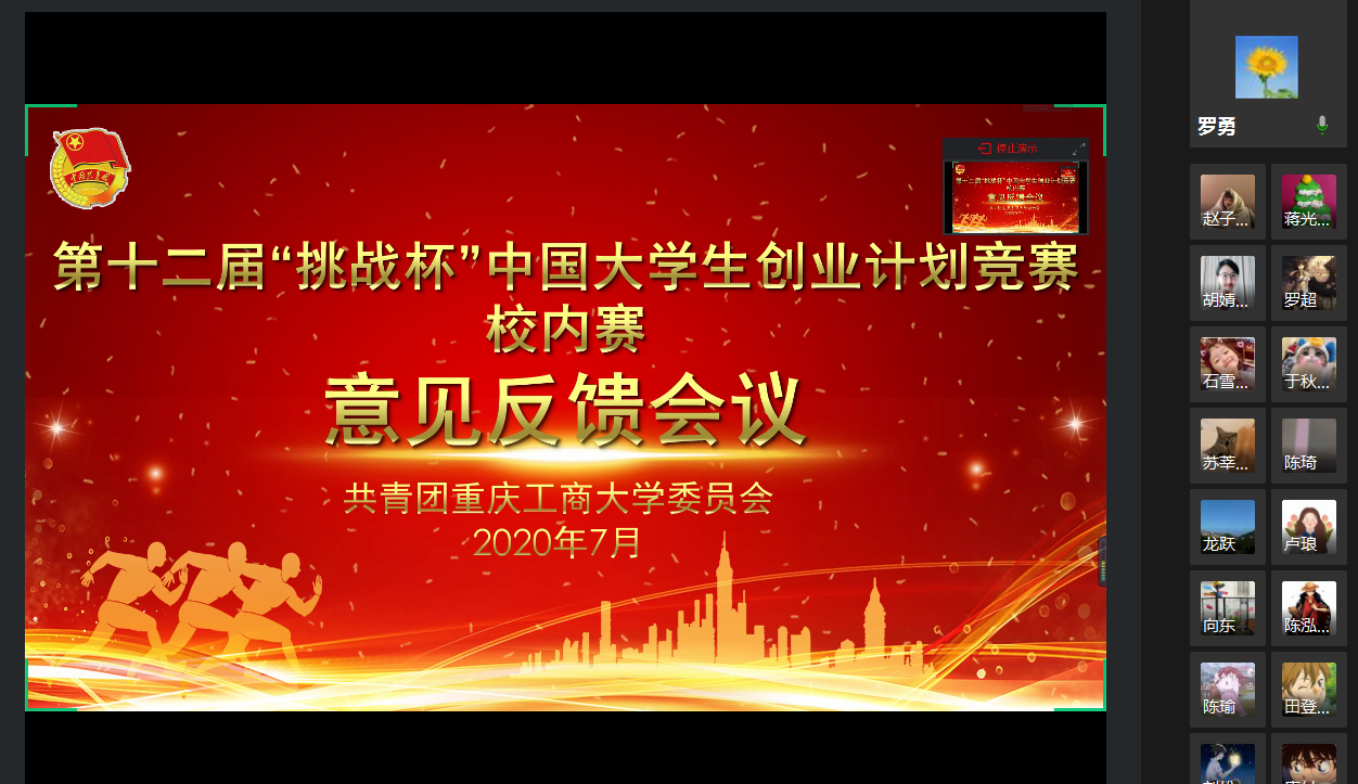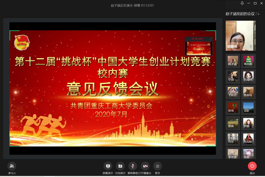 7月20日下午,由校团委举办的第十二届“挑战杯”中国大学生创业计划竞赛校内赛意见反馈会议在企业微信平台顺利举行,此次会议邀请到罗勇教授、杨柏教授、张贤明教授、梁云教授、侯明喜副教授等5位老师作为评审专家,为入选校内赛获得金奖的13组参赛选手计划书进行专业指导,提出建设性意见。参会的人员有获得校赛金奖的项目负责同学和指导老师。会议由校团委副书记胡婧婷主持。