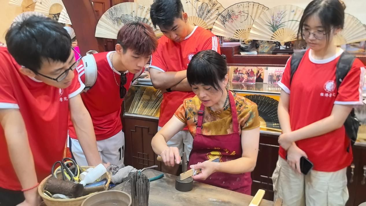 随后,为帮助实践团成员们切身感受折扇16道工段、145道工序,领悟传统手工技艺历经千年传承的独特魅力和精髓,尹春莲详细为团队成员们演示了折扇的推架摸架以及抛光打磨的制作工序。团队成员们从尹老师熟练的手艺背后,深刻体会到以尹青莲为代表的“守”艺人毫无怨言历经岁月的沉淀,其背后日复一日的坚守造就了如今脱颖而出的荣昌折扇。尹春莲对荣昌折扇的发展充满信心,但也指出了非遗折扇传承所面临的困难和挑战,她希望更多的“匠人”、非遗爱好者对荣昌折扇进行再设计和宣传推广,持续发扬传承非遗文化。