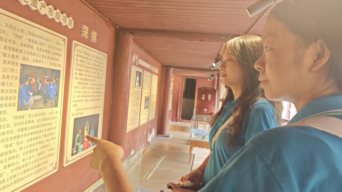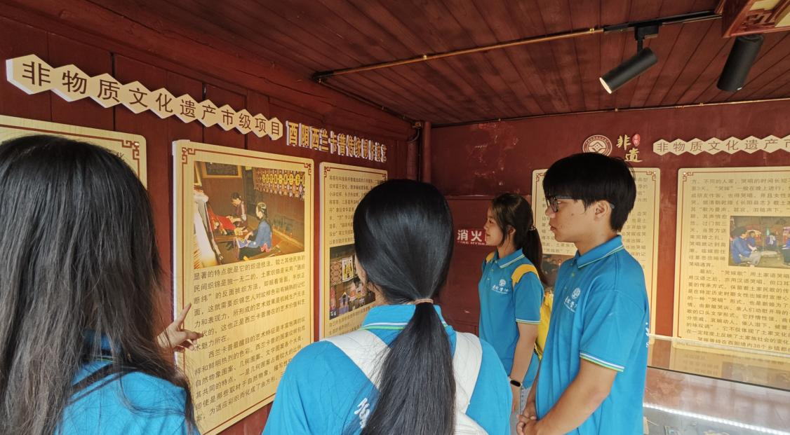 探访西秦会馆,体悟古韵今风。西秦会馆承担着古镇传统民俗表演专业场所的作用,不少非物质文化遗产在这里展示。会馆中,汇集着酉阳民歌、酉阳古歌、面具阳戏、酉阳耍锣鼓、上刀山、薅草锣鼓等国家级非遗项目。重庆市级非遗项目《梯玛古歌》每天在这里上演,引得无数游客驻足观看。在会馆的两侧,陈列着酉阳特色文化的简介,例如,酉阳土家摆手舞、木叶吹奏、西兰卡普传统制作技艺等。传承团成员用镜头记录下精彩瞬间,用心感受乡村振兴战略为非遗文化带来新的生机,也更加坚定了保护非遗、传承非遗的决心。