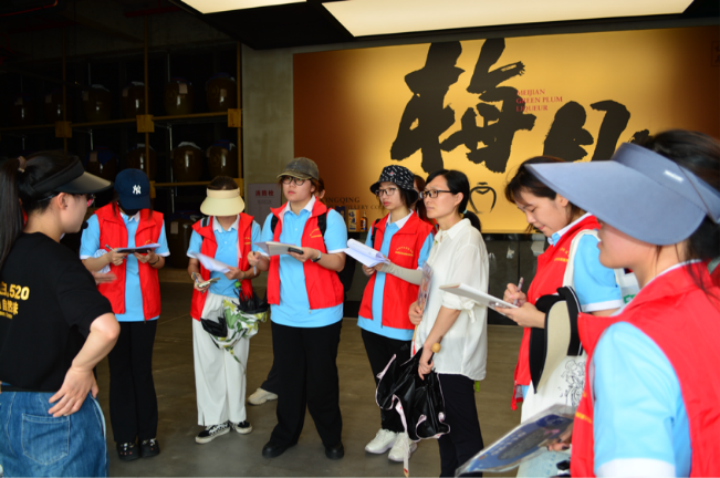 在酒庄工作人员的引导下,践行团分别参观了现代化的储酒罐区、“201手工精酿车间”、地下陶缸储酒区、“梅见”年份酒库。感受到了规模化生产的磅礴气势以及酒庄对品质的极致追求。最令同学们动容的是品牌背后的社会担当。工作人员介绍,“梅见”果酒系列创立初心是传承中华优秀传统果酒文化、打造民族品牌高品质果酒。此外,江记酒庄践行绿色可持续发展理念,将酒糟转化为饲料,循环利用酿酒副产品。