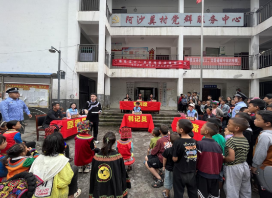 团队师生走进凉山州甘洛县吉米镇阿沙莫村九莫组和瓦古脚组搭建起彝汉双语模拟法庭。在反家暴的庭审演绎里,藏着对弱者的守护;在反霸凌的情景再现中,映照着对少年的呵护。彝族队员木乃以铁负责全程翻译,让法律条文跨越语言隔阂,庭审后递出的普通话手册,载着沟通无碍的期盼。校企协同的捐赠现场,崭新的生活物资堆成小山,助学款紧握在彝族孤儿掌心,每一份帮扶都像一缕暖阳,融解山区振兴路上的冰霜。