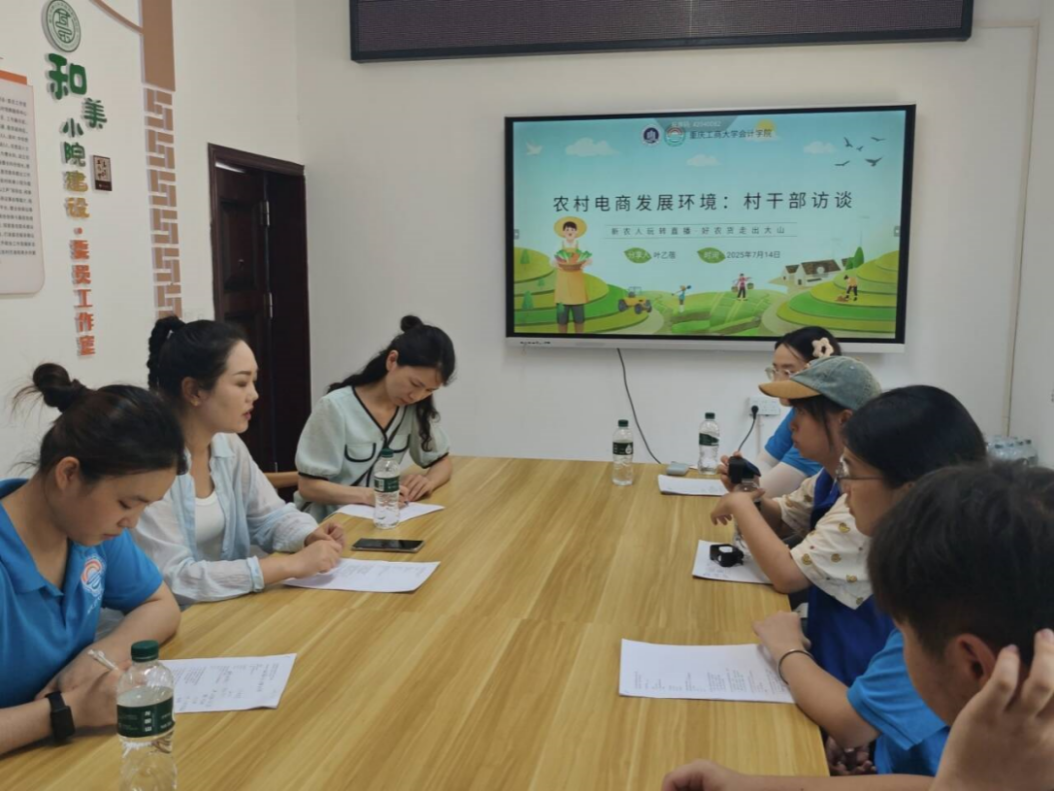 在红岩村村委会,团队与当地村委吴书记的一席谈话揭开了此次活动的序幕。红岩村的直播始于几年前:当时青脆李丰收过剩,又遭遇暴风雨威胁,红岩村在与时间赛跑,村干部当机立断,开启直播卖货。这个决定让红岩村的农产品从此不愁销路。据了解,去年该村通过电商直播实现利润约8万元,全部存入村集体账户,公开透明,但在成本核算等方面仍存在困惑。访谈结束后,团队成员还与其他村干部进行了问卷调查和采访,进一步摸清了当地电商发展的实际情况。