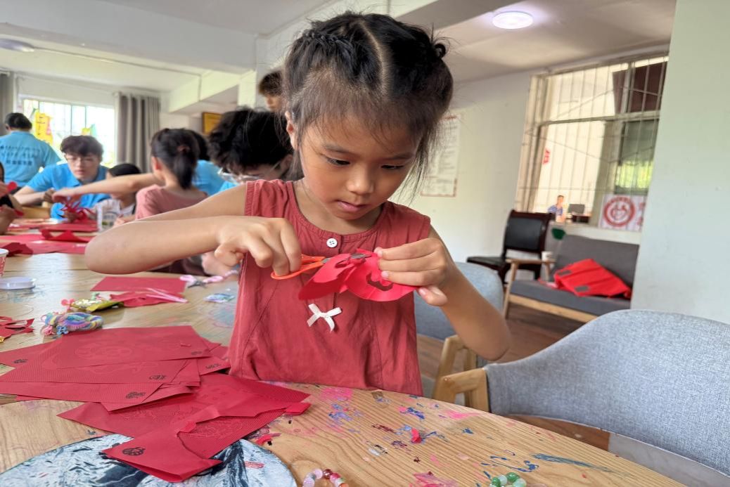 7月15下午,“艺绘乡韵”剪纸艺术活动在一片欢声笑语中拉开帷幕。活动现场,彩纸与剪刀交错,孩子们与志愿者们围坐在一起。大家灵动的手指在彩纸上飞舞,一折一剪之间,一幅幅饱含乡村风情的剪纸作品逐渐成型。剪纸艺术的魅力,不仅锻炼了孩子们的动手能力,更如一支画笔,在他们心灵深处勾勒出对家乡的美好憧憬,加深了他们对这片土地的眷恋与热爱。