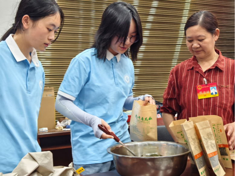 离开田间,尹老师带大家走进厂房加工区,详细介绍了花椒的初加工流程。她强调:“每一步都不能省,这是咱们的口碑。”简洁有力的话语,让成员们体会到一颗花椒背后的细致与坚持。随后,她指导大家进行花椒包装的实践,舀取、装填、封袋,指尖麻香萦绕,汗水浸透衣衫,实践热情却丝毫不减。
