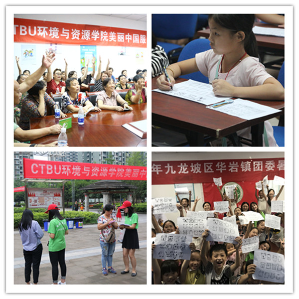 近日,环境与资源学院“美丽中国”实践团走进九龙坡区华岩镇田坝村社区开展了为期一周的暑期嘉年华活动。活动中,志愿者们不仅开设了多彩的兴趣课程,还结合所学专业知识,开展了有关垃圾分类科普知识宣讲,社区垃圾桶分类回收标志实物化等活动,使社区人民受益匪浅。