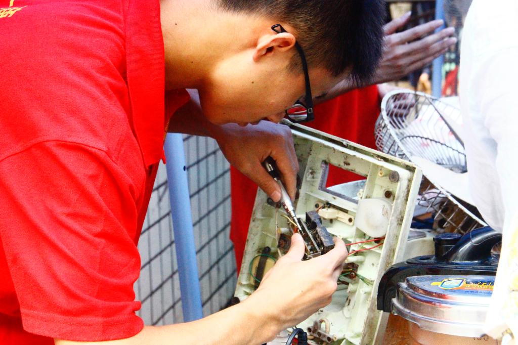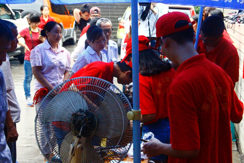 队员们热情地为当地居民介绍本次维修活动,并向广大居民发放安全使用家电的注意事项手册。在维修过程中,队员们不仅将家电的故障进行了维修,并对家电进行了清理、润滑,为了延长家用电器的使用年限,队员们还对家用电器进行了改造,使其更加经久耐用。炎热的天气下,队员们认真细致的维修电器,居民们贴心地为队员们扇扇子、送水,以解暑热。经过全体成员的辛苦劳动,本次家电维修活动共修好电风扇8台、电饭煲3件、电磁炉3台、热水壶3件、手电筒2个、奶油搅拌机1台、笔记本电脑2台。