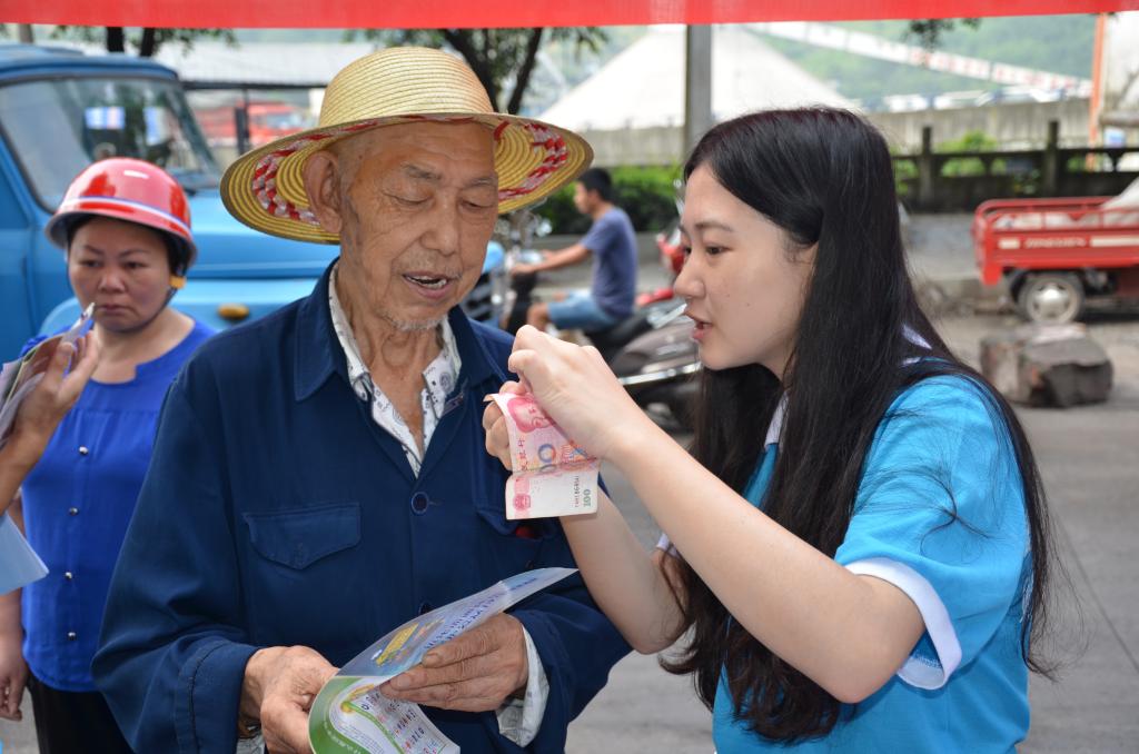 宣讲会紧扣基层群众金融需求,提供多层次的咨询服务。在宣讲过程中,各个年龄层对金融知识的关注点各不相同,20-30岁的返乡青年对农业创业方面的政策扶持和融资平台尤为关注;30-50岁的中年人则更加关心商业保险产品的种类和投保途径;50岁以上的老年人对金融诈骗知识相对匮乏。面对这些问题,服务团成员和重庆农村商业银行龙桥分理处工作人员运用专业知识,配合手机银行、支付宝等手机理财软件进行演示,一一为其答疑解惑。同时,为有创业意愿的人普及如众筹、第三方支付等新兴金融工具相关知识,让更多更全面的商业保险种类进入到中年人的视野,同时也用钞票现场展示“一看,二模,三听”的假币识别方法。