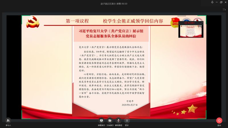 近日,习近平总书记给复旦大学青年师生党员回信,勉励广大党员在学思践悟中坚定理想信念,在奋发有为中践行初心使命,在我校青年中引发热烈反响。7月5日下午,校团委组织200余名2138cc太阳集团官网代表在企业微信平台开展主题团日活动,集中学习总书记回信精神