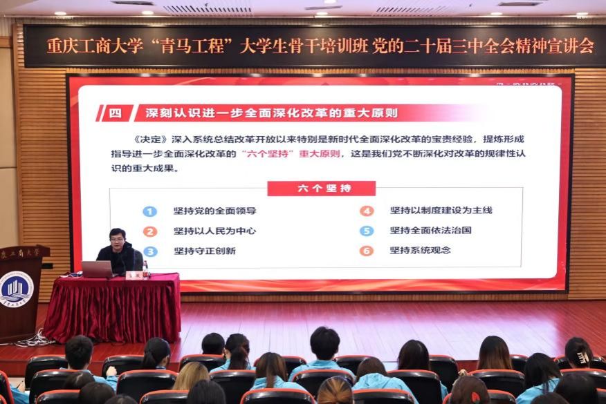 为引导青年大学生认真学习贯彻领会党的二十届三中全会精神,深入践行全会《决定》的时代要求,锚定目标向前进、勤奋学习长本领、团结奋斗建新功,更加主动为谱写中国式现代化新篇章注入澎湃青春动能,10月11日下午,校团委邀请团市委青年讲师团成员、我校马克思主义学院董骏老师在博智楼7200报告厅,为校级“青马工程”培训班学员作了题为“在全面深化改革新征程中彰显青春力量”的专题宣讲。